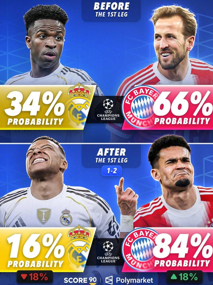 #欧冠[超话]# 欧冠淘汰赛首回合战罢,相关预测平台也更新了各队的晋级概率。根据Score90援引Polymarket给出的最新数据,拜仁和阿森纳都在首回合赢球后进一步占据晋级主动。